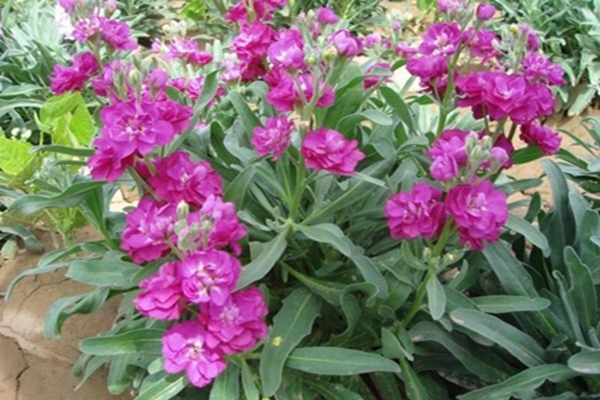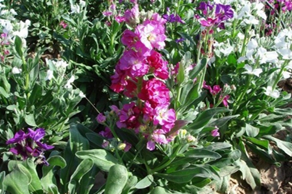 紫羅蘭比較矮,最高也就是60厘米左右,莖直立,有分枝,葉為披針形,花數量比較多,花朵不太大,其花的顏色有淡紅、白色、紫色等。